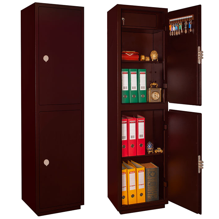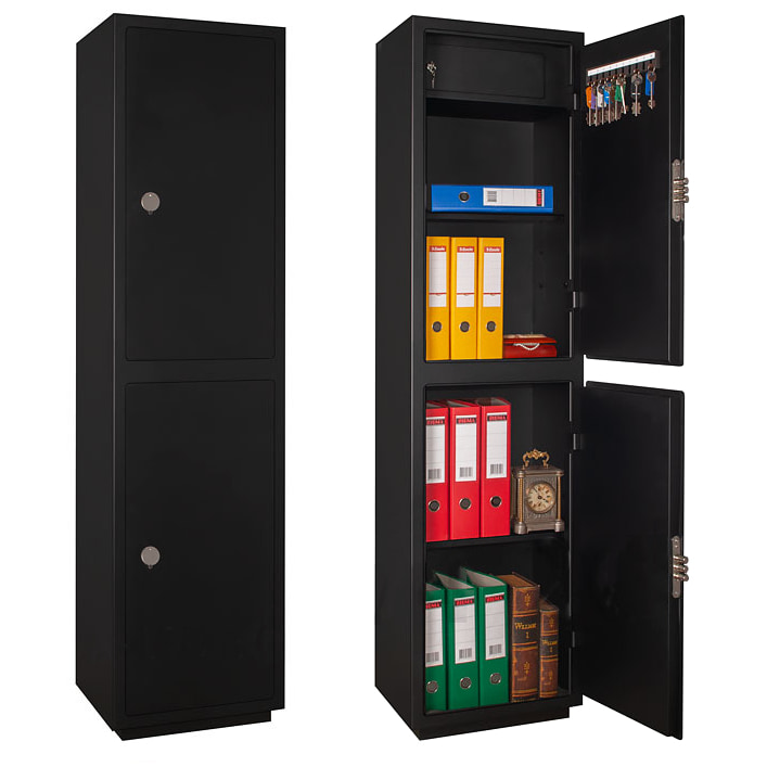- Внутри верхней секции — кассовое отделение, съемная полка.