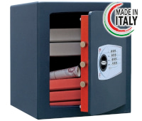 Сейф изготовлен с использованием инновационной технологии лазерной резки Taglio Laser благодаря чему достигается максимальная прочность сварных швов и минимальные зазоры между корпусом и дверью. Защита замка и ригелей от высверливания с помощью твердой пластины из марганцовистой стали толщиной 3 мм, установленной под углом.