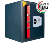 Сейф изготовлен с использованием инновационной технологии лазерной резки Taglio Laser благодаря чему достигается максимальная прочность сварных швов и минимальные зазоры между корпусом и дверью. Защита замка и ригелей от высверливания с помощью твердой пластины из марганцовистой стали толщиной 3 мм, установленной под углом.